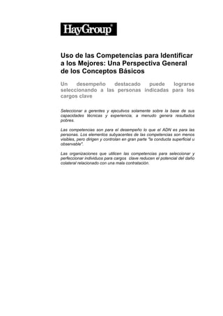 El documento resume los conceptos clave sobre el uso de competencias para identificar a los mejores empleados. McClelland confirmó que los indicadores tradicionales de desempeño como pruebas de aptitud y resultados de exámenes no predicen realmente el desempeño laboral. En su lugar, propuso evaluar las competencias subyacentes, como rasgos y motivos, que conducen a un mejor desempeño. Las organizaciones pueden lograr mejores resultados al seleccionar personas con competencias diferenciadoras para cargos clave.