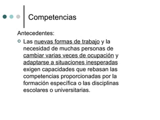 El documento describe los conceptos de competencias laborales y educación basada en competencias. Explica que las competencias son capacidades evaluables que permiten un desempeño satisfactorio en situaciones reales de trabajo. También describe que la educación basada en competencias se enfoca en los resultados del aprendizaje de los estudiantes y está basada en estándares. Finalmente, presenta un modelo de competencias docentes que incluye diseñar experiencias de aprendizaje, ser un experto en la disciplina y evaluar el aprendizaje de los estudiantes.
