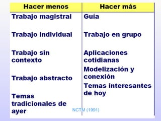 1. El documento describe la evolución del currículo de matemáticas en la educación secundaria obligatoria en España, con cambios como la LOGSE, LOE y decretos de mínimos. 2. Se discuten diferentes enfoques para la enseñanza de las matemáticas a lo largo de los años, incluyendo el énfasis reciente en el desarrollo de competencias. 3. También se analiza el concepto de competencia matemática y su importancia para la vida cotidiana y la educación.