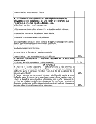 Este documento presenta las competencias básicas y genéricas requeridas para los psicólogos. Las competencias básicas incluyen aplicar métodos de diagnóstico y tratamiento en diferentes ámbitos de la psicología, comunicarse efectivamente con diferentes audiencias, elaborar estrategias de intervención, contribuir a la calidad de vida de las personas, utilizar herramientas de investigación y practicar aspectos éticos y legales. Las competencias genéricas incluyen desarrollar una cosmovisión cristiana, tomar iniciativas creativas,