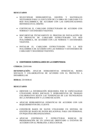 Este documento presenta los contenidos curriculares de varias competencias relacionadas con el mantenimiento de equipos de cómputo, redes, herramientas ofimáticas y habilidades blandas. Incluye códigos, horas y resultados esperados en cada competencia en áreas como instalación de software y hardware, cableado estructurado, bases de datos, redes sociales, inglés técnico e interacción social y laboral.