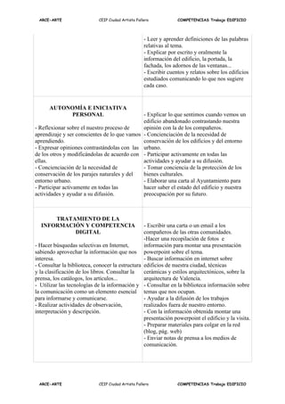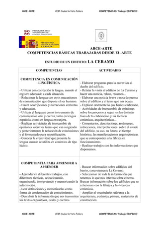 Este documento describe un proyecto educativo que utiliza el estudio de un edificio histórico llamado La Ceramo para desarrollar varias competencias básicas en los estudiantes. El proyecto involucra actividades como visitar el edificio, investigar su historia y arquitectura, y realizar trabajos artísticos y escritos relacionados con el edificio y la alfarería. El objetivo es que los estudiantes mejoren sus habilidades en comunicación, aprendizaje autónomo, tratamiento de información, pensamiento social y