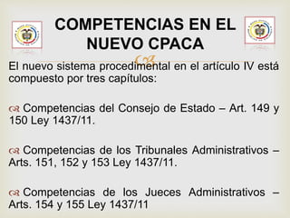 El documento presenta un análisis comparativo entre el Decreto 01 de 1984 y la Ley 1437 de 2011, destacando las competencias del Consejo de Estado, los tribunales administrativos y los jueces administrativos en varios contextos. Se detallan las respectivas competencias y procedimientos relacionados con la nulidad de actos administrativos, elecciones y expropiaciones, así como las instancias de apelación y recursos disponibles. Además, se abordan las particularidades de la jurisdicción contenciosa administrativa y la revisión de decisiones en varios niveles de autoridad.