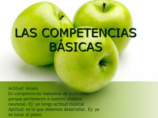 Este documento describe las diferentes competencias básicas que deben desarrollarse, incluyendo la competencia en comunicación lingüística, matemática, interacción con el mundo, tratamiento de la información y competencia digital, social y ciudadana, cultural y artística, aprender a aprender, autonomía e iniciativa personal y emocional. Define actitudes como innatas y aptitudes como aquello que debe desarrollarse, y proporciona ejemplos de elementos incluidos en cada competencia.