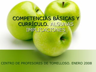 Este documento trata sobre las competencias básicas y su inclusión en el currículo educativo español. Explica brevemente la evolución de los currículos desde la LOGSE hasta la LOE, haciendo hincapié en cómo cada una ha ido incorporando un mayor énfasis en las competencias. También define qué son las competencias básicas, cuáles son las que se consideran fundamentales y cómo se pueden evaluar e incorporar al currículo de los centros educativos.