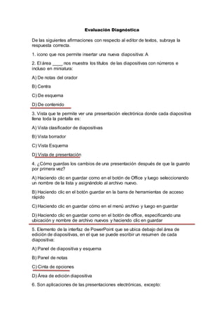 El documento presenta los criterios y competencias para elaborar presentaciones originales y creativas utilizando el editor de presentaciones, incluyendo el uso de animaciones multimedia, efectos y un lenguaje formal. El objetivo es que los estudiantes utilicen estas herramientas tecnológicas para mejorar sus aprendizajes y causar un impacto en la audiencia. Se incluye una evaluación diagnóstica con preguntas sobre las funciones básicas del editor de presentaciones.