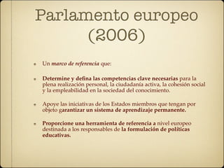 Este documento establece un marco de referencia para definir las competencias clave necesarias para el desarrollo personal, la ciudadanía activa y la empleabilidad en la sociedad del conocimiento. Apoya las iniciativas de los estados miembros para garantizar el aprendizaje permanente y proporciona una herramienta para los responsables de políticas educativas.