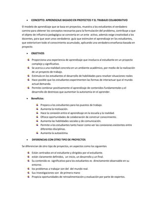 El documento describe el aprendizaje basado en proyectos y el trabajo colaborativo. Explica que este método involucra a los estudiantes en proyectos complejos y del mundo real para desarrollar habilidades. Los beneficios incluyen una mejor preparación para el trabajo, mayor motivación y conexión entre la escuela y la realidad. Se diferencia de otros proyectos en estar centrado en el estudiante y dirigido por él, con problemas del mundo real. La importancia del reconocimiento de experiencias previas es que permite mejorar el procesamiento de información y