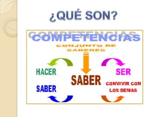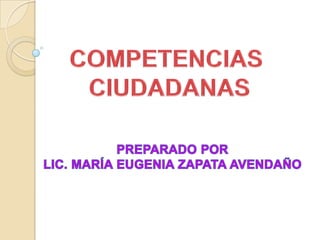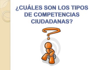 El documento habla sobre las competencias ciudadanas necesarias para el ejercicio de la ciudadanía, incluyendo la capacidad cognitiva para comprender información cívica, habilidades emocionales para identificar y responder a las emociones propias y de los demás, y habilidades comunicativas para establecer un diálogo constructivo. También menciona que estas competencias se articulan en la acción ciudadana y que los estándares de calidad educativa deben garantizar que los estudiantes desarrollen estas competencias.