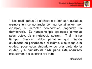 El documento trata sobre la formación de competencias ciudadanas en Colombia. Describe que la educación debe formar a los ciudadanos de acuerdo a la constitución para fomentar la democracia. Establece que la escuela es un espacio ideal para desarrollar estas competencias como el respeto, la participación democrática y la valoración de las diferencias. Finalmente, presenta los lineamientos para la enseñanza de las competencias ciudadanas en las escuelas colombianas.