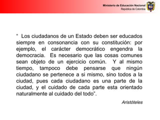Este documento del Ministerio de Educación Nacional de Colombia describe la importancia de formar competencias ciudadanas en los estudiantes. Define las competencias ciudadanas como un conjunto de conocimientos y habilidades cognitivas, emocionales y comunicativas que permiten a los ciudadanos actuar de manera constructiva en la sociedad democrática. Detalla los tres grupos de competencias ciudadanas - convivencia y paz, participación y responsabilidad democrática, y pluralidad e identidad - y los diferentes tipos de competencias que las componen. Resalta que la escuela es un espacio ideal