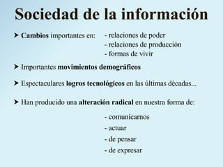 El documento describe la necesidad de desarrollar competencias clave en los estudiantes para hacer frente a los retos de una sociedad de la información. Explica que las competencias clave incluyen la comunicación, el pensamiento crítico, la resolución de problemas y el aprendizaje a lo largo de la vida. También discute el nuevo papel del profesor como mediador del aprendizaje de los estudiantes y la integración de las TIC en el currículo para mejorar los procesos de enseñanza y aprendizaje.