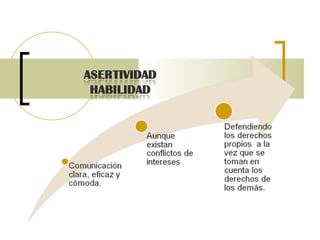 El documento habla sobre las habilidades comunicativas. Explica que estas incluyen habilidades de recepción como escuchar activamente y empatizar, y habilidades de emisión como enviar mensajes claros. También cubre la comunicación no verbal, sus funciones como complementar o contradecir mensajes verbales, y características como variar entre culturas. Por último, discute la autoafirmación y actitudes asertivas.