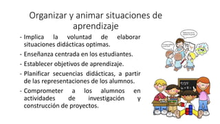 Este documento describe 10 nuevas competencias que los maestros necesitan para enseñar efectivamente de acuerdo a Philippe Perrenoud, incluyendo organizar situaciones de aprendizaje centradas en el estudiante, gestionar la progresión del aprendizaje, desarrollar métodos de diferenciación, involucrar a los estudiantes en su aprendizaje, trabajar en equipo, participar en la gestión de la escuela, informar e involucrar a los padres, usar nuevas tecnologías, enfrentar deberes éticos de la profesión