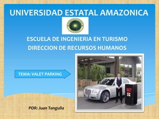 Este documento describe el rol de valet parking en un hotel. Explica que un valet parking es un asistente que se encarga de estacionar los vehículos de los clientes de manera segura y eficiente. Detalla las funciones principales de un valet parking como recibir el vehículo, estacionarlo, entregar las llaves, recoger el vehículo cuando el cliente se va, y entregar el vehículo al cliente. También incluye el perfil deseado para un valet parking, incluyendo cortesía, buena presentación y habilidades de conducción