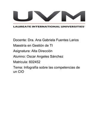 Un CIO es un ejecutivo clave en una empresa que se encarga de alinear las actividades tecnológicas con la estrategia de negocio. Las 5 competencias esenciales de un CIO exitoso son la alineación estratégica, la ejecución, la visión y estrategia, fomentar la innovación y la cultura y el talento. Un buen CIO usa la tecnología y los datos para expandir los beneficios y aumentar el rendimiento de la empresa.