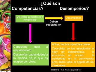 Este documento presenta el marco curricular por competencias en la Escuela Nacional de Bachillerato (ENB). Explica conceptos clave como competencias genéricas, disciplinares y profesionales. Las competencias genéricas son comunes a todos los egresados y capacitan a los estudiantes para aprender de forma autónoma a lo largo de su vida. Las competencias disciplinares expresan conocimientos, habilidades y actitudes en campos como matemáticas y ciencias experimentales. Finalmente, las competencias profesionales preparan a los jóvenes para desarrollarse