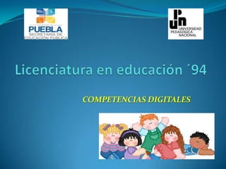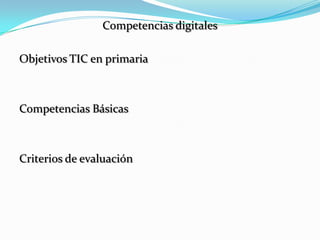 Este documento describe las competencias digitales y objetivos de tecnologías de la información y comunicación (TIC) en la educación primaria. Define las competencias básicas, incluyendo el tratamiento de la información y competencias digitales. Explica que la competencia digital es importante para el aprendizaje a lo largo del ciclo y cubre elementos como alfabetización foto visual, duplicación creativa y ramificada e informacional. La estrategia propuesta es integrar las competencias digitales en actividades didácticas en internet para compartir conocimiento.