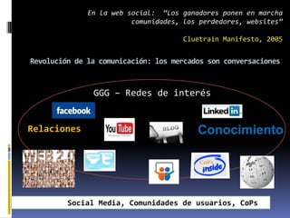 Este documento describe las competencias digitales básicas necesarias para trabajar en la sociedad de la web. Explica que las redes sociales como Facebook, Twitter y LinkedIn son importantes para establecer relaciones y compartir conocimiento. También destaca la importancia de habilidades como crear blogs, subir videos a YouTube y usar lectores de feeds para mantenerse actualizado con la información.