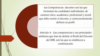 Este documento describe las competencias docentes requeridas para los maestros de la Escuela Preparatoria de Matehuala según la Reforma Integral de la Educación Media Superior. Identifica ocho competencias principales: 1) organización de la formación continua, 2) dominio y estructuración de saberes, 3) planificación centrada en competencias, 4) efectividad e innovación en la enseñanza, 5) evaluación formativa, 6) construcción de ambientes de aprendizaje autónomo y colaborativo, 7) contribución al desarrollo integral de