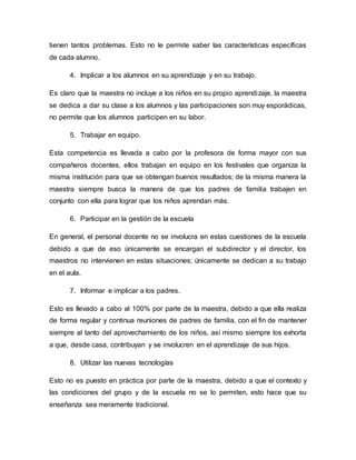 El resumen analiza las competencias docentes de la profesora Beatriz Acosta según el marco de Perrenoud. La profesora cumple con organizar y animar el aprendizaje, gestionar la progresión mediante evaluación continua, e implicar a los padres. No diferencia entre alumnos, ni implica a los alumnos en su aprendizaje. Trabaja en equipo con otros docentes pero no participa en la gestión escolar ni se forma continuamente.
