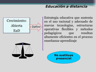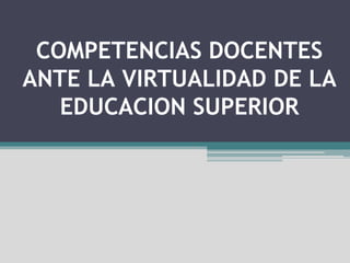 El documento describe las competencias docentes necesarias ante la virtualidad de la educación superior. Explica que la educación a distancia es una estrategia educativa que utiliza tecnologías y métodos pedagógicos flexibles para enseñar sin la presencia física de profesores y alumnos. Un docente virtual debe ser planeador, desarrollador de contenidos, administrador, tener interés en las TICs, y actuar como tutor e intermediario del aprendizaje. También debe diseñar guías, evaluar y desarrollar estrategias instructivas como