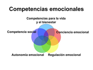 El documento presenta las competencias emocionales esenciales para la vida y el bienestar, incluyendo conciencia emocional, regulación emocional, autonomía emocional y competencia social. Se enfatiza la importancia de habilidades como la autoeficacia, gestión de conflictos y la adopción de comportamientos responsables para potenciar el bienestar personal y social. Además, se ofrecen enlaces para más información y dudas sobre el tema.