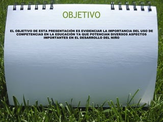 Este documento describe la importancia de las competencias tecnológicas en la educación y cómo potencian el desarrollo de los niños. Explica que las competencias incluyen habilidades, conocimientos, actitudes y valores relacionados con la tecnología. Detalla algunos ejemplos de cada uno de estos elementos y cómo se manifiestan en el uso de la tecnología.