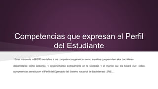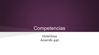 Este documento describe las competencias genéricas que deben desarrollar los estudiantes de bachillerato según el Acuerdo 442. Estas competencias constituyen el Perfil del Egresado y buscan que los estudiantes se desenvuelvan exitosamente en la sociedad. Se definen 11 competencias agrupadas en áreas como autonomía, comunicación, pensamiento crítico, aprendizaje a lo largo de la vida, trabajo colaborativo, responsabilidad social y respeto a la diversidad. También presenta las competencias del Perfil del Docente de acuerdo
