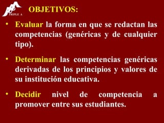 El documento presenta información sobre la evaluación y redacción de competencias genéricas en la educación. Propone determinar las competencias derivadas de los principios y valores de la institución educativa y decidir el nivel de competencia a promover entre los estudiantes. Además, sugiere rediseñar las competencias genéricas emitidas por la Secretaría de Educación Pública para alinearlas con los objetivos de la institución.