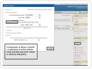 Este documento describe los pasos para realizar una búsqueda en PubMed sobre el tema de "¿Qué aportan a la docencia de enfermería la utilización de las nuevas tecnologías de la información y comunicación?". Explica cómo traducir la pregunta al inglés con DeCS y usar operadores booleanos para encontrar artículos relevantes. Luego muestra pantallazos de 5 artículos seleccionados y sus referencias bibliográficas en RefWorks, así como enlaces a los artículos completos o al título de la revista en Fama