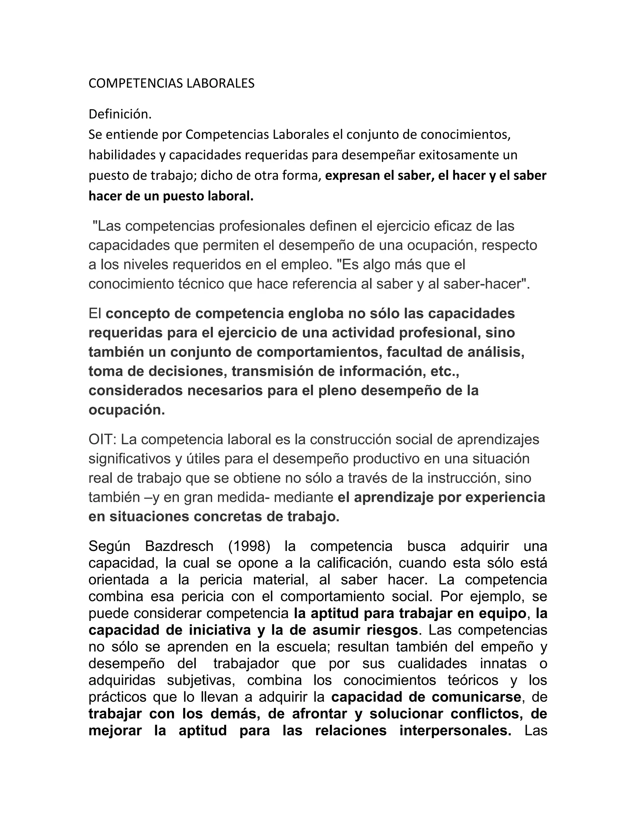 El documento define las competencias laborales como el conjunto de conocimientos, habilidades y capacidades requeridas para desempeñar exitosamente un puesto de trabajo. Las competencias no solo incluyen conocimientos técnicos sino también comportamientos, análisis, toma de decisiones y comunicación. Las competencias se adquieren a través de la instrucción y la experiencia laboral. Las competencias engloban el saber hacer técnico así como comportamientos sociales como el trabajo en equipo y la iniciativa.