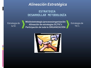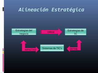 Este documento describe la importancia de alinear las estrategias de cadena de suministro y tecnologías de la información de una organización. Explica que la misión, estrategia, procesos, clientes y tecnología deben estar alineados para dirigir e impactar efectivamente las estrategias del negocio y la cadena de suministro. También destaca que las tecnologías de la información son una fuente competitiva clave al permitir la optimización de procesos logísticos y el soporte de decisiones a través del análisis de datos