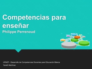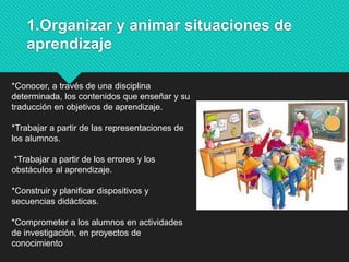 Este documento describe 10 competencias clave para enseñar de manera efectiva. Estas competencias incluyen la capacidad de organizar situaciones de aprendizaje, gestionar la progresión del aprendizaje de los estudiantes, utilizar diferentes métodos de enseñanza, involucrar a los estudiantes en su aprendizaje, trabajar en equipo, participar en la administración de la escuela, comunicarse con los padres, usar tecnología, abordar dilemas éticos y organizar su propia formación continua.