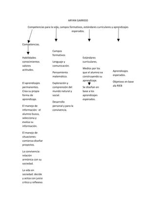 El documento describe los componentes clave de un plan de estudios, incluyendo competencias, campos formativos, estándares curriculares y aprendizajes esperados. Explica que los estándares curriculares se diseñan en base a los aprendizajes esperados y objetivos definidos en la RIEB, y que los campos formativos cubren áreas como lenguaje, matemáticas, ciencias naturales, desarrollo personal y convivencia.
