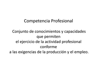 Este documento define las competencias profesionales como un conjunto de conocimientos y capacidades que permiten el ejercicio de la actividad profesional. Las competencias comprenden capacidades de diferentes tipos que permiten lograr resultados de manera ética e integran el saber, saber hacer y saber ser. Las competencias deben entenderse de forma sistémica para resolver problemas en el contexto laboral y de vida.