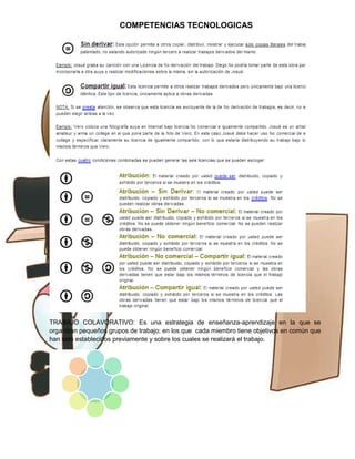 El documento describe conceptos clave relacionados con la tecnología y las competencias digitales. Explica los derechos de autor, licenciamiento, trabajo colaborativo, las diferencias entre Google Drive, Word y PowerPoint, gestores de referencias, hojas de cálculo en Drive y componentes básicos de un blog como entradas, títulos, plantillas y gadgets.