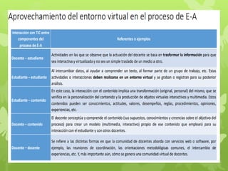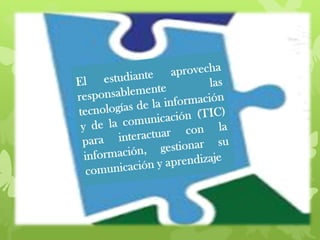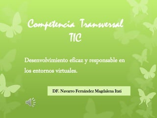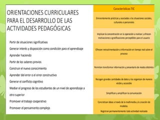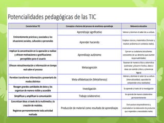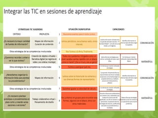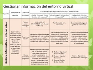 Este documento describe la competencia transversal de TIC y sus cuatro pilares: ser, conocer, convivir y hacer. La competencia TIC se compone de cuatro capacidades que se refieren a los desempeños de los actores educativos en cuatro ámbitos: cultura digital, gestión del conocimiento, identidad digital y comunidad virtual. El documento también discute cómo las actividades educativas con y sin TIC pueden diferir a pesar de tener los mismos contenidos o desarrollo de capacidades.