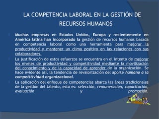 Este documento describe el uso de la competencia laboral en la selección de personal. Explica que las empresas han adoptado un enfoque basado en competencias para mejorar la productividad y las relaciones laborales. Este enfoque se aplica a áreas como la selección, remuneración, capacitación y promoción. También describe los pasos para implementar un sistema de gestión por competencias, incluida la definición de competencias genéricas y específicas y la creación de perfiles laborales.