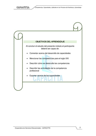 Este documento trata sobre las competencias, capacidades y aptitudes en los procesos de enseñanza y aprendizaje. Explica que las competencias van más allá de los conocimientos y habilidades, y también involucran valores y comportamientos. Describe diferentes modelos de competencias, capacidades y niveles de aprendizaje. También discute herramientas como el coaching que pueden facilitar el desarrollo de competencias a largo plazo.