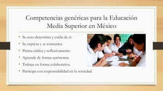Este documento presenta las competencias genéricas para la educación media superior en México. En 3 oraciones o menos, resume lo siguiente: El documento define 11 competencias genéricas que los estudiantes de educación media superior deben desarrollar. Estas competencias incluyen el autoconocimiento, la comunicación, el pensamiento crítico, el aprendizaje autónomo, el trabajo colaborativo y la participación cívica. Además, se explica brevemente qué son las competencias disciplinares y la importancia del enfoque de "aprender a aprender" y el