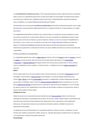 La competitividad se refiere a la capacidad de una empresa u país para generar mayor satisfacción de los consumidores a un precio determinado o ofrecer un menor precio a una calidad determinada. Depende de factores como la relación calidad-costo, la productividad, la innovación y los salarios. Las tecnologías de la información y comunicación también juegan un papel importante al permitir mejoras en procesos internos, de producción y compra online.