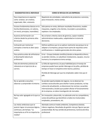 El documento analiza por qué algunas empresas no son competitivas. Explica que las características de los individuos que dirigen las empresas, como la falta de análisis, innovación y valores, pueden reflejarse negativamente en la organización al obstaculizar su competitividad. También señala que para que una empresa sea competitiva, debe realizar un análisis interno y contar con líderes sólidos que innoven, sostengan los objetivos de la organización y ayuden a alcanzar su visión.