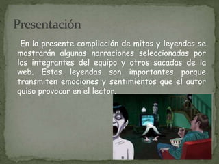 El documento presenta varias leyendas y mitos compilados por un equipo de estudiantes. Incluye historias como "La Laura maligna", "El monstruo del armario", "La niña fea del columpio", "El túnel de los gritos" y "La leyenda del jamón". El propósito es transmitir emociones a través de estas narraciones folclóricas.