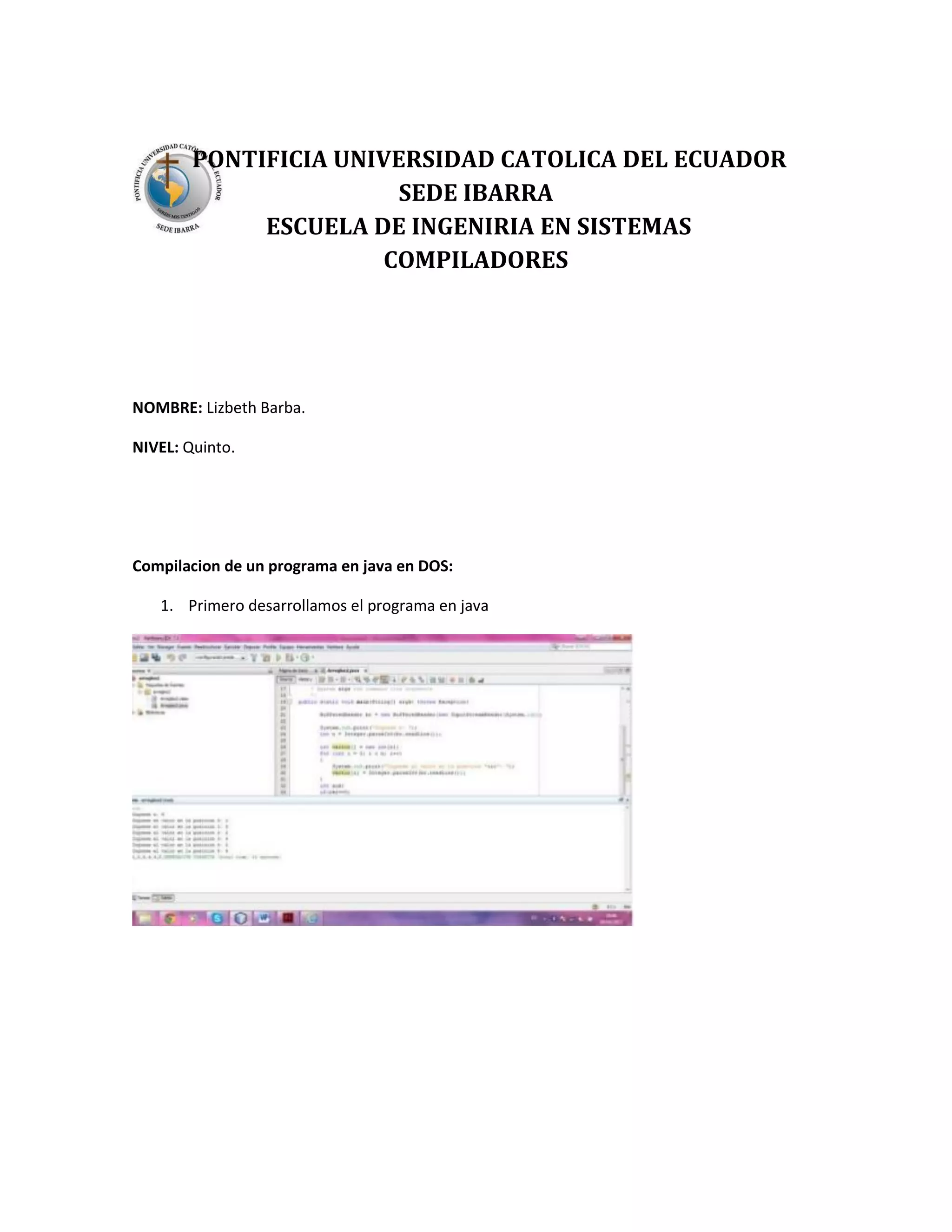Este documento describe los pasos para compilar un programa en Java en el sistema operativo DOS. Primero se desarrolla el programa en Java, luego se busca el archivo .java en la carpeta del proyecto y se ejecutan los comandos "javac nombreprograma.java" y "java nombreprograma" en el cmd para compilar y ejecutar el programa respectivamente. Además, incluye un ejemplo de código Java que ordena vectores de forma ascendente o descendente dependiendo de si el tamaño del vector es par o impar.