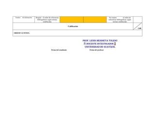 El documento detalla una escala de valoración para ensayos y trabajos académicos que evalúa aspectos como la extensión, claridad de ideas, desarrollo del tema, citas y referencias, así como gramática y ortografía. Además, incluye métodos para organizar y presentar información visual, incluyendo mapas mentales y resúmenes estructurados en formato APA. Se establecen criterios específicos para calificar la calidad del trabajo, la relevancia del contenido y la presentación general del mismo.