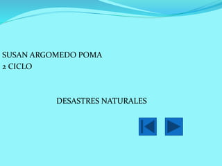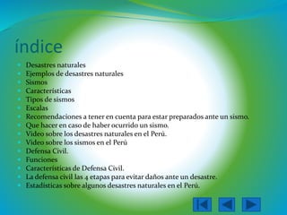 Este documento trata sobre desastres naturales, en particular terremotos. Explica qué son los desastres naturales y da ejemplos como terremotos y tsunamis. Luego describe las características de los terremotos incluyendo el foco, epicentro y tipos de movimiento sísmico. También cubre escalas para medir la magnitud de terremotos, recomendaciones ante terremotos, y las funciones de defensa civil para prepararse y responder a desastres.