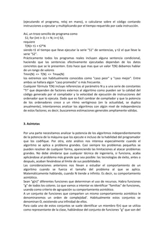 Este documento presenta un resumen de los conceptos fundamentales del análisis de algoritmos y la complejidad computacional. Introduce las medidas de tiempo de ejecución de algoritmos y las funciones asintóticas para analizar el comportamiento cuando el tamaño del problema tiende a infinito. Define las clases de órdenes de complejidad como O(1), O(log n), O(n), O(n log n), etc. y explica su impacto práctico al resolver problemas de diferentes tamaños. Finalmente, enumera propiedades matemáticas para calcular ór