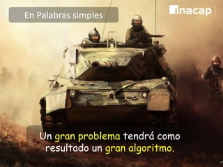 Problemas grandes requieren algoritmos complejos que ofrezcan soluciones sofisticadas, mientras que problemas más pequeños y sencillos pueden resolverse con algoritmos más simples y directos.