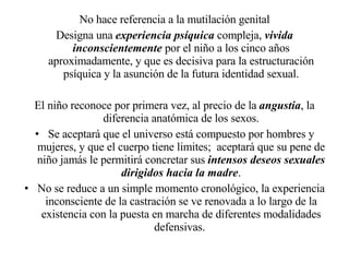 El documento describe el complejo de castración según la teoría psicoanalítica de Freud. Explica que el complejo surge cuando los niños descubren la diferencia anatómica entre los sexos, lo que genera angustia sobre la posible pérdida del pene. En niños y niñas, este complejo marca el fin del amor hacia la madre e inicio del Edipo. Sin embargo, en niñas también genera envidia del pene y odio hacia la madre castrada.